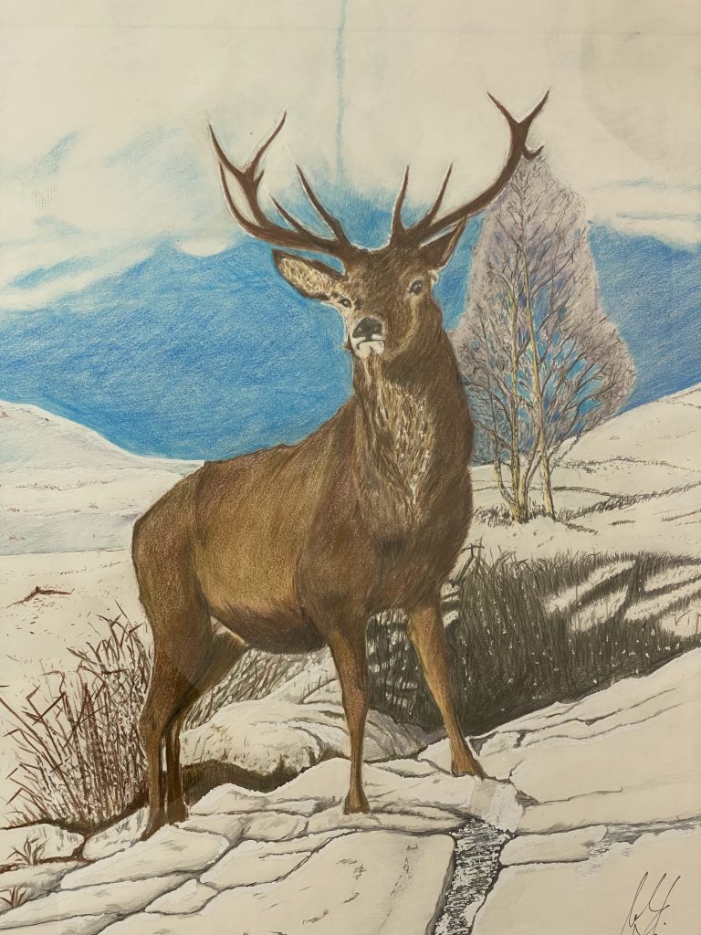 Highland Cow Red Squirrel Pheasant in Glen Nevis Highland Stag Mark’s wife Still Life Mark, self portrait at 18 years old Teddy & Chester, Mark’s Schnauzers 1920’s building Stag amongst the ferns